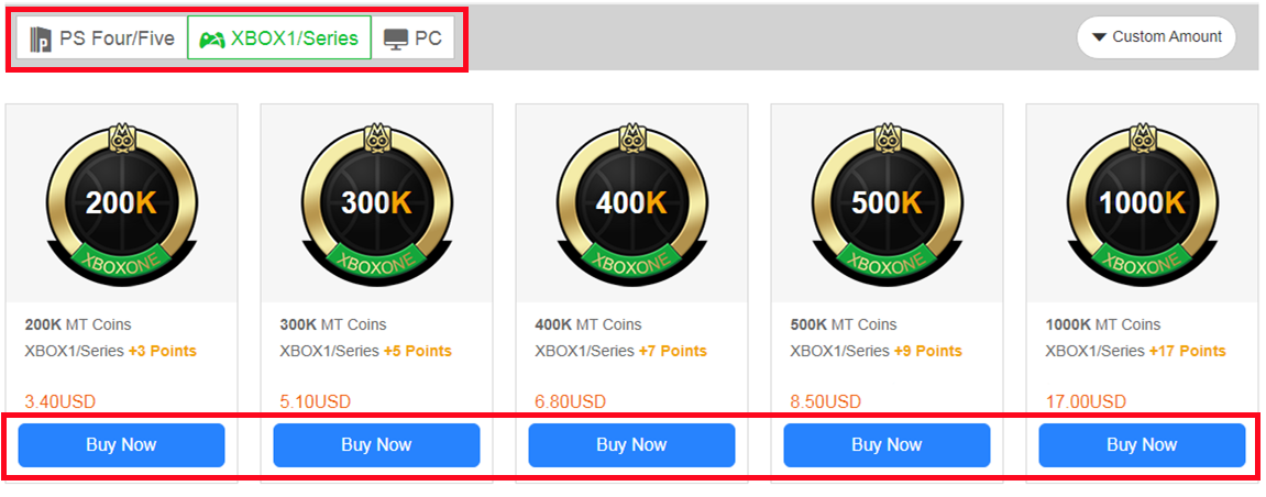 2. Choose your console and the number of MT coins you need, then click "Buy Now".