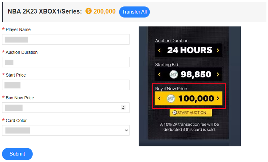 6. Auction your own card on the transfer market in-game, set the auction duration to 24 hours, set the start price as a random number, and set the buy now price to 100K. Fill in the player information in the form as required, and click "Submit".